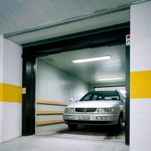 Thường là loại thiết kế chắc chắn, an toàn, có hệ thống giám sát chỉ cho phép thang máy chạy khi xe hơi đã vào đúng vị trí. Thường thiết kế loại cabin có 2 cửa đối xưng nhau.